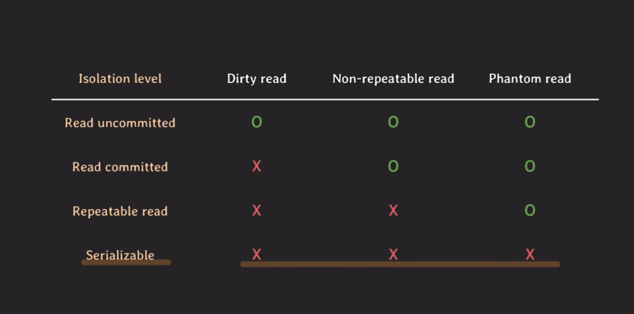 4. Serializable : 3가지 현상 뿐만아니라 다른 모든 이상 현상 방지