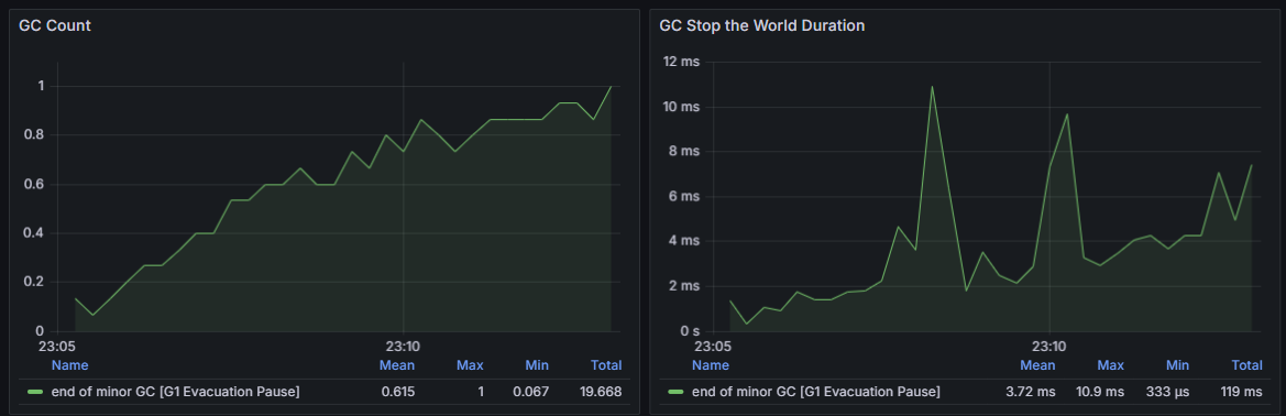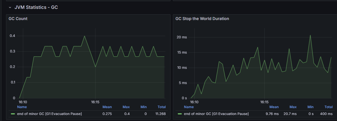 GC카운트와 시간입니다. 10분간 0.4초 동안 STW가 발생합니다. 양호한 편이지만 캐시 적용시 더 줄어들 여지가 있습니다.