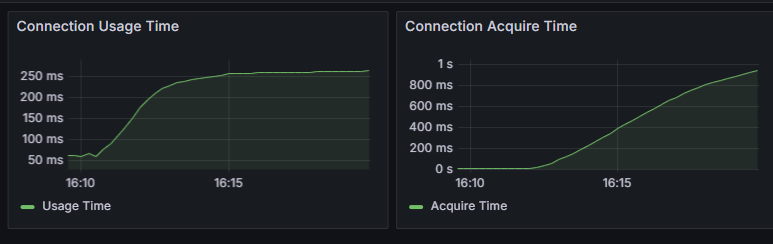 커넥션 병목으로 인해 사용시간은 0.25초, 획득 시간은 후반부에 1초까지 대기하는 모습입니다.