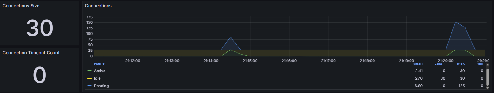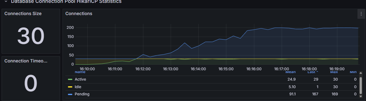 30개의 커넥션 풀로 요청을 감당하지 못하는 모습입니다.